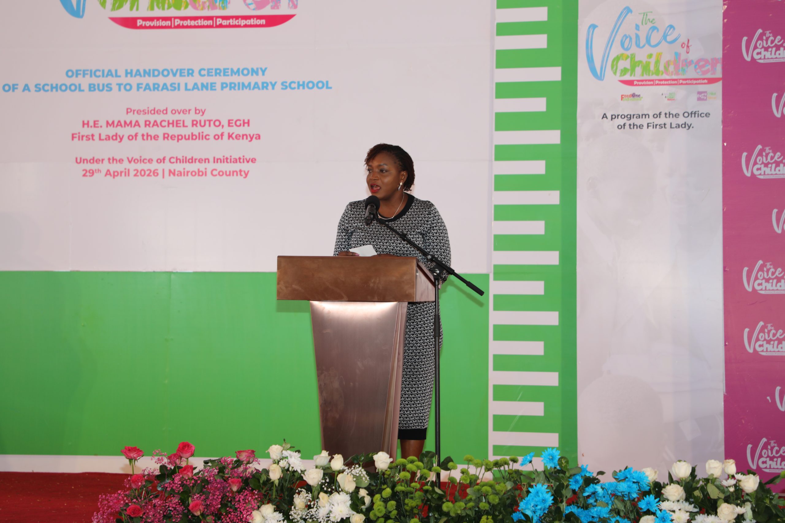 Amb. Nakhumicha Wafula joined the Her Excellency, the First Lady, Rachel Ruto, EGH during her official visit to Farasi Lane Primary School, today, 29th April, 2026. H.E. the First Lady was visiting the school for the second time to handover the bus she did promise on 30th May 2025 at UN-Habitat side event where she championed sustainable urban farming under “Mama Kitchen Garden Initiative” that aims to promote food security and nutrition in schools across the country.